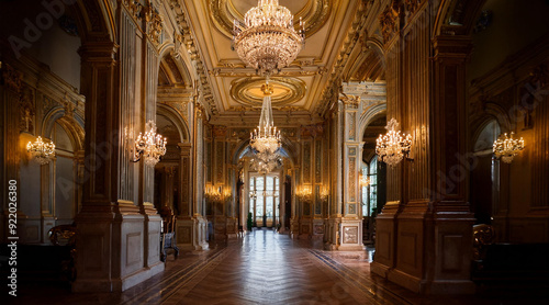 Elegant indoor setting with rich, baroque architecture, dimly lit with chandeliers