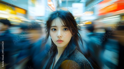 Elegant Japanese Woman Navigating Blurred City Crowd in Modern Attire