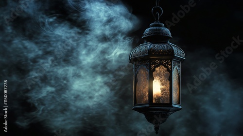 Elegant lantern illuminating dark space with intricate patterns and soft smoke effect