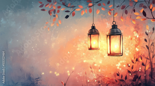 Elegant lanterns glowing in a dreamy twilight setting surrounded by soft foliage