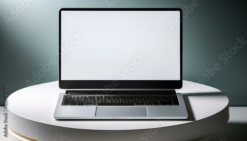 Elegant laptop on a clean white pedestal, featuring a blank screen for advertising and professional display. 3D Render