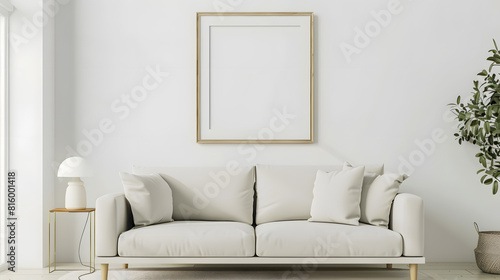 Elegant living room interior design with mockup poster frame modern sofa and stylish accessories Eucalyptus wall Template Copy space : Generative AI