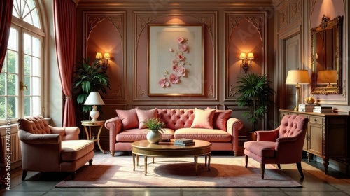 Elegant Living Room with Plush Pink Furniture and Ornate Details