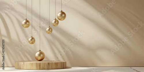 Elegant minimalist scene with golden spheres hanging on wires in a well-lit room with shadows, featuring a wooden round platform.