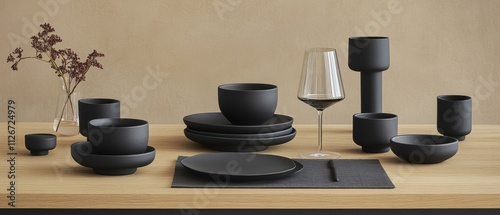Elegant Minimalist Table Setting with Black Ceramics and Wine Glass