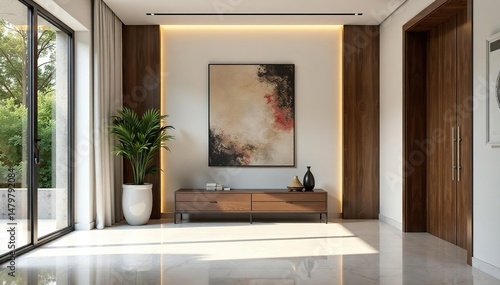 Elegant modern foyer with stylish wall art and natural light streaming in , image, abstract, modern