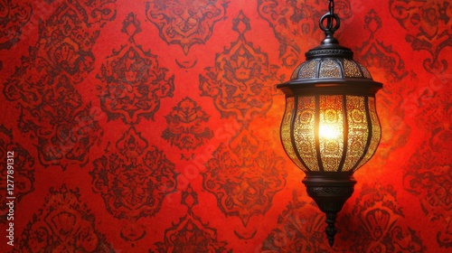 Elegant Moroccan Lantern Illuminating Vintage Red Damask Wallpaper Background