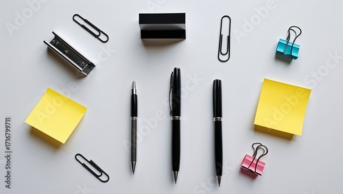 Elegant office supplies arranged on white background with pens, sticky notes, and paper clips for business and design projects