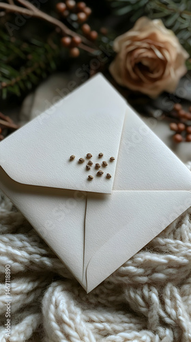Elegant off-white square envelope adorned with tiny gold dots, resting on a cozy knit fabric
