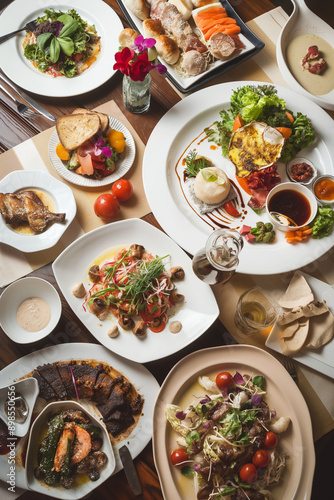 Elegant Overhead View of a Gourmet Feast: A Vibrant and Inviting Table Setting