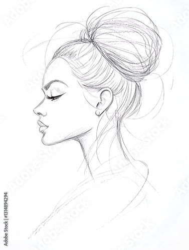 Elegant pencil sketch of a woman in profile featuring a high bun hairstyle and delicate facial features.