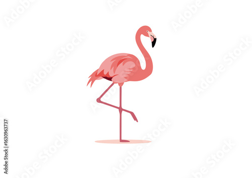 Elegant pink flamingo standing on one leg. Vector illustration of a tropical bird on a white background.
