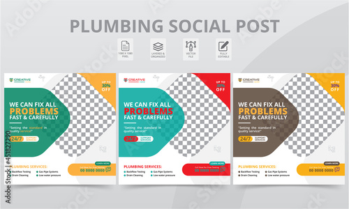 Elegant Plumber Social Media Post Attractive Templates. Professional plumbing services square banner layouts template with geometric shapes for social media posts and web internet ads.