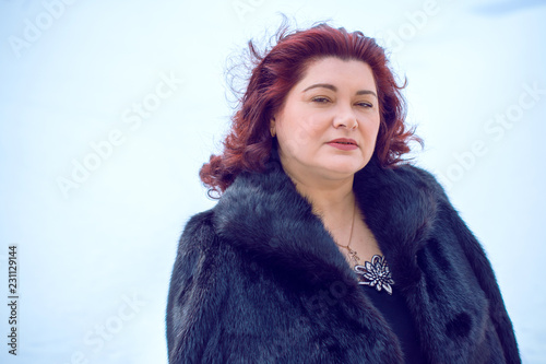 Elegant plus size woman in fur coat at winter. Big Lady at park, cold time. Fashionable womens lifestyle
