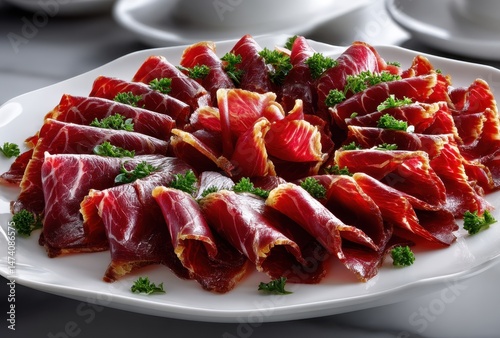 Elegant presentation of gourmet cured meat platter adorned with fresh herbs on a classic white ceramic plate in a modern dining setting
