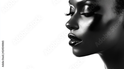 Elegant profile portrait of a young woman with dark skin showcasing natural beauty in dramatic black and white tones against a stark white background.
