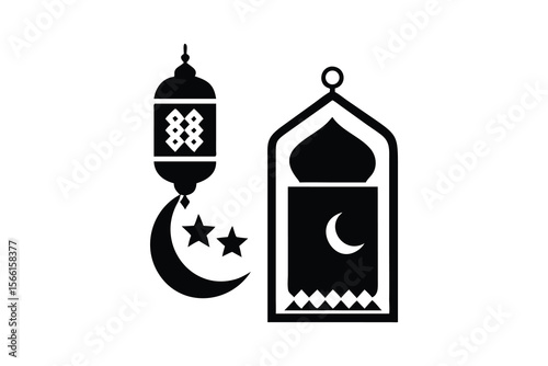 Elegant Ramadan Icons: Crescent Moon, Stars, and Ornate Islamic Lanterns; Black and White Minimalist Vector Graphics for Festive Cards, Invitations, and Digital Designs.