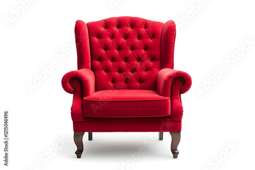 Elegant red velvet armchair with wooden legs. Santa's red velvet armchair isolated on white background