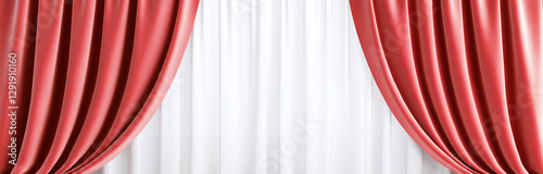 Elegant red velvet curtains frame soft white backdrop, creating luxurious atmosphere. Perfect for enhancing any interior space with touch of sophistication