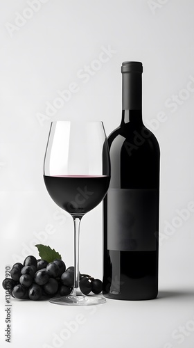 Elegant red wine bottle with a glass of wine and fresh grapes on a clean backdrop.