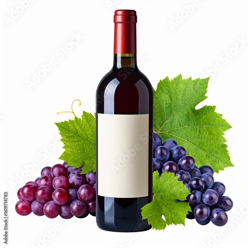 Elegant Red Wine Bottle with Blank Label Surrounded by Grapes on White Background