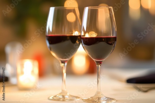 Elegant red wine glasses set on a dining table during a romantic evening with soft lighting