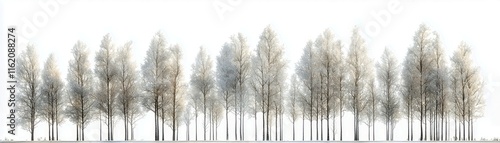 Elegant Row of Bare Trees Against a White Background in Winter Landscape Evoking Serenity and Minimalism for Nature and Seasonal Photography