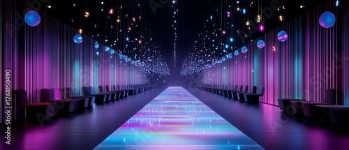 Elegant runway venue illuminated by colorful lights for a fashion event in a modern setting at night celebration stage, podium, advertising, design style, display, AI