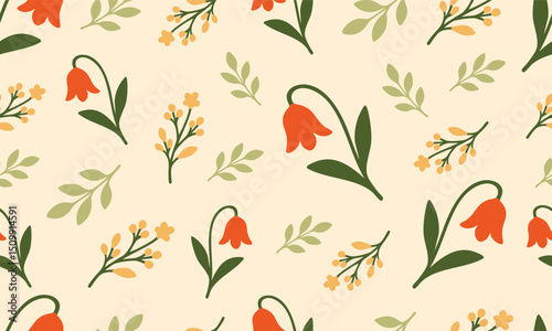 Elegant seamless floral pattern with red bell shaped flowers, soft yellow buds, and green leaves on a cream background. Perfect for textiles, wallpapers, and decorative design projects.