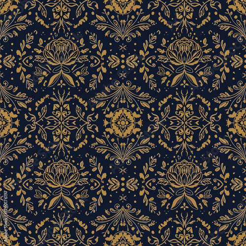 Elegant seamless pattern featuring floral elements on dark blue background, seamless pattern, Stock royalty.