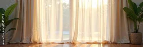 Elegant sheer window curtains gently billowing in a soft breeze, filtering sunlight into a bright room Perfect for adding a touch of airy sophistication to any space , sophisticated, soft