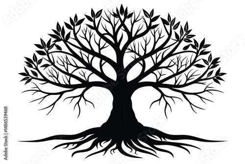 Elegant silhouette of a lush tree showcasing intricate branches and roots vector art