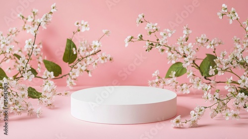 Elegant Spring Blossom Scene with White Cylindrical Display Stand on Pink Background