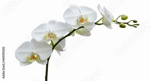 Elegant stem of white orchid flowers with multiple blossoms, isolated on white background for floral and decorative purposes.