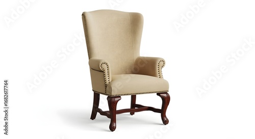 Elegant tall wingback armchair with ornate upholstery and dark wooden legs