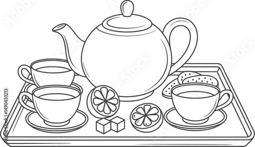 Elegant tea party line art illustration with teapot,cups,lemons,and biscuits