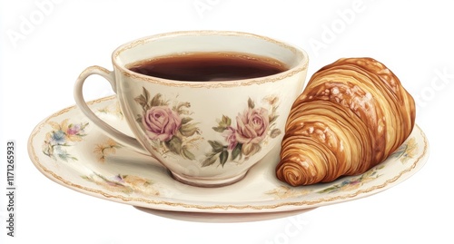 Elegant Teacup with Coffee and a Delicious Croissant on a Decorative Plate, Capturing a Warm and Inviting Breakfast Moment of French Cuisine and Classic Design
