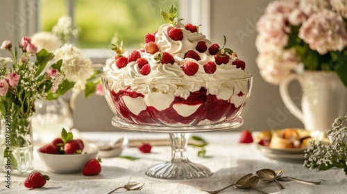 Elegant trifle dessert with layers of cream, fresh raspberries, and mint leaves presented in a crystal bowl on a table decorated with flowers and natural light