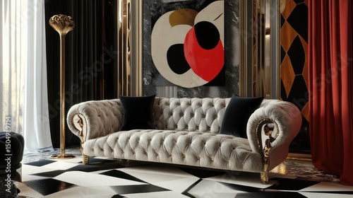 Elegant Tufted Sofa in Luxurious Modern Interior with Abstract Art