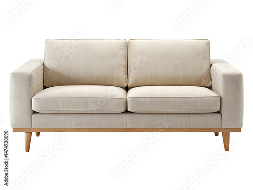 Elegant two seater sofa with light fabric upholstery and wooden base