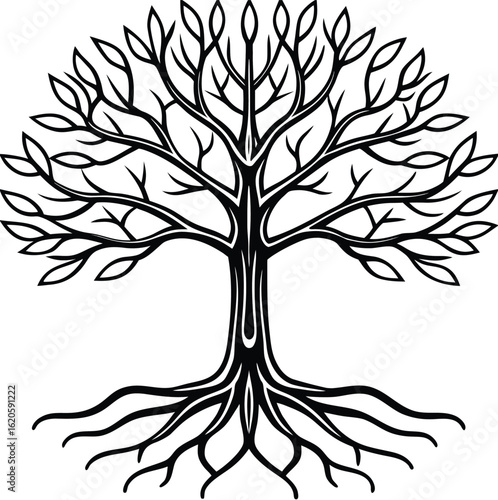 Elegant vector tree silhouette with roots and leaf details, ideal for nature and season designs