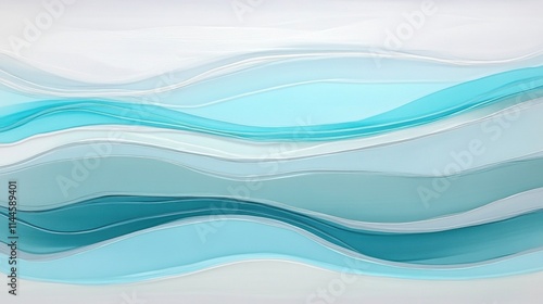 Elegant waves of light turquoise and aquamarine blend seamlessly with soft gray, creating a tranquil representation of flowing motion and peaceful oceanic vibes under a clear, open sky.