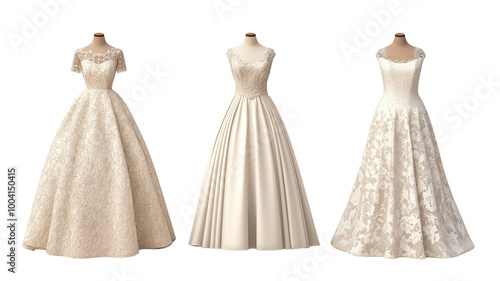 Elegant wedding dresses displayed in row, showcasing intricate lace and beautiful designs. Each gown features unique details, perfect for memorable occasion
