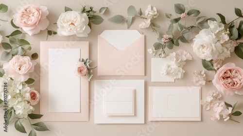Elegant wedding stationery model showcasing invitations, RSVP cards, and menus, with a soft toned background adorned with pink peonies and eucalyptus leaves, creating a romantic atmosphere