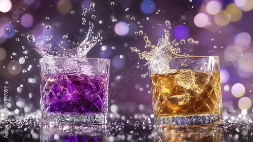 Elegant Whiskey Splash in Crystal Tumblers with Diamond Bokeh Background