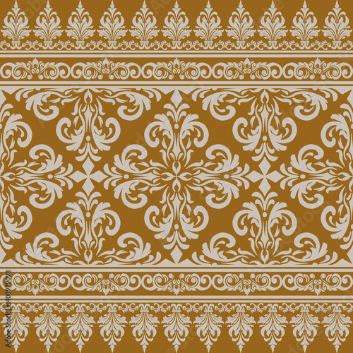 Elegant White and Brown Damask Seamless Border Pattern for Luxury Wallpaper, Textile, Invitation, Packaging, Wedding, Classic Decor