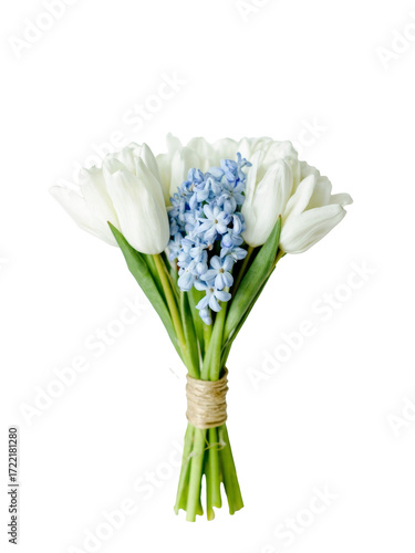 Elegant White Tulip and Blue Hyacinth Bouquet - Transparent PNG DESCRIPCION An elegant bouquet featuring crisp white tulips and delicate blue hyacinths, tied together with a rustic twine bow. This ar