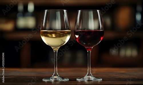 Elegant Wine Pairing: Red and White Wine Glasses on Rustic Wooden Table