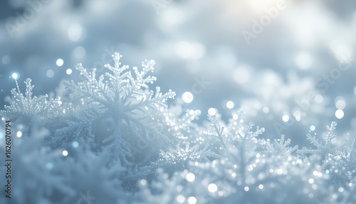 Elegant winter holiday background with sparkling snowflakes and soft bokeh lights creating a festive atmosphere