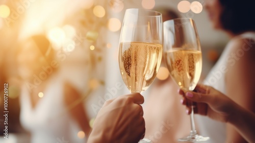 Elegant women clink glasses of champagne in a joyous celebration, surrounded by festive lights, exuding sophistication and happiness.